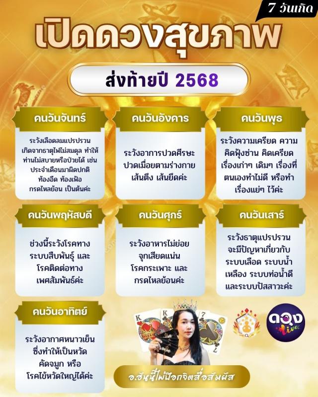 เปิดดวงสุขภาพ 7 วันเกิด ส่งท้ายปี 2568 ทำนายโดย: อาจารย์ฮันนี่ ไพ่ป๊อกจิตสื่อสัมผัส