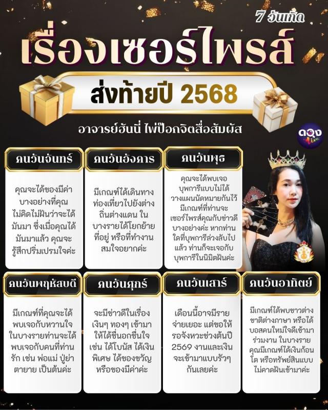 เรื่องเซอร์ไพรส์ 7 วันเกิด ส่งท้ายปี 2568 ทำนายโดย: อาจารย์ฮันนี่ ไพ่ป๊อกจิตสื่อสัมผัส