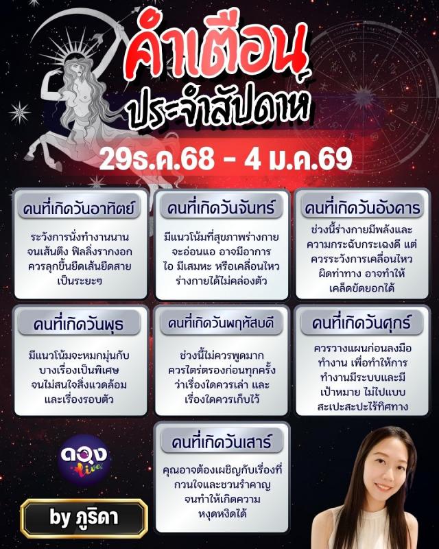 คำเตือนประจำสัปดาห์ วันที่ 29 ธันวาคม 2568 – 4 มกราคม 2569 โดย ภูริดา
