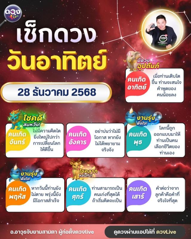 ดวงรายวันประจำวันอาทิตย์ที่ 28 ธันวาคม 2568 โดย อ.อาวุธจับยามสามตา – ผู้ก่อตั้งดวง Live