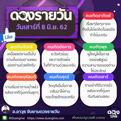 ดวงรายวันประจำวันเสาร์ที่ 8 มิถุนายน 62