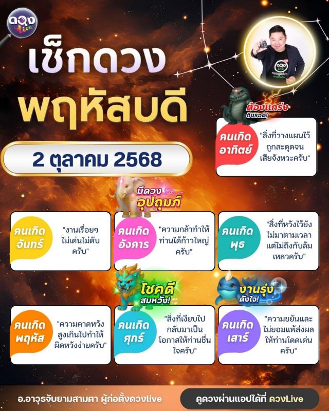 ดวงรายวันพฤหัสบดีที่ 2 ตุลาคม 2568 โดย อ.อาวุธจับยามสามตา – ผู้ก่อตั้งดวงLive