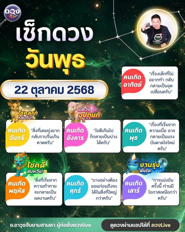 ดวงรายวันพุธที่ 22 ตุลาคม 2568  โดย อ.อาวุธจับยามสามตา – ผู้ก่อตั้งดวง Live