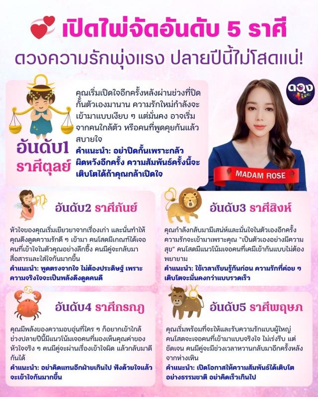 เปิดไพ่จัดอันดับ 5 ราศีดวงความรักพุ่งแรง ปลายปีนี้ไม่โสดแน่! by MADAM ROSE