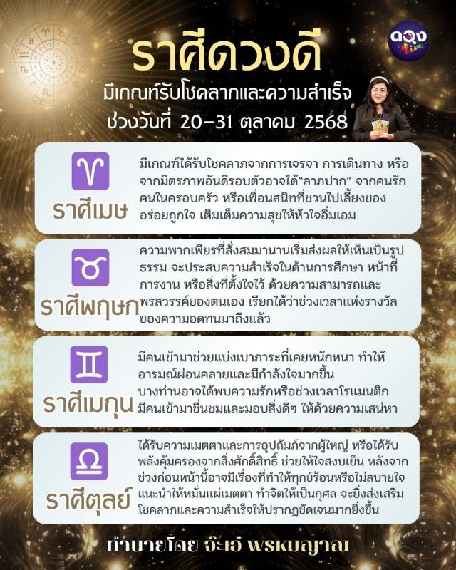 ราศีดวงดี มีเกณฑ์รับโชคลาภและความสำเร็จ ช่วงวันที่ 20–31 ตุลาคม 2568 byจ๊ะเอ๋ พรหมญาณ