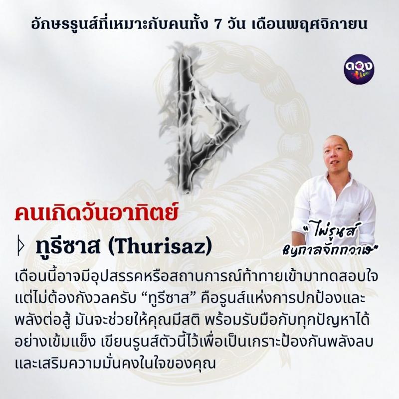 เดือนนี้อาจมีอุปสรรคหรือสถานการณ์ท้าทายเข้ามาทดสอบใจ “ทูรีซาส” คือรูนส์แห่งการปกป้องและพลังต่อสู้ ช่วยให้คุณมีสติ พร้อมรับมือกับทุกปัญหาได้อย่างเข้มแข็ง เขียนรูนส์ตัวนี้ไว้เพื่อเป็นเกราะป้องกันพลังลบ และเสริมความมั่นคงในใจของคุณ