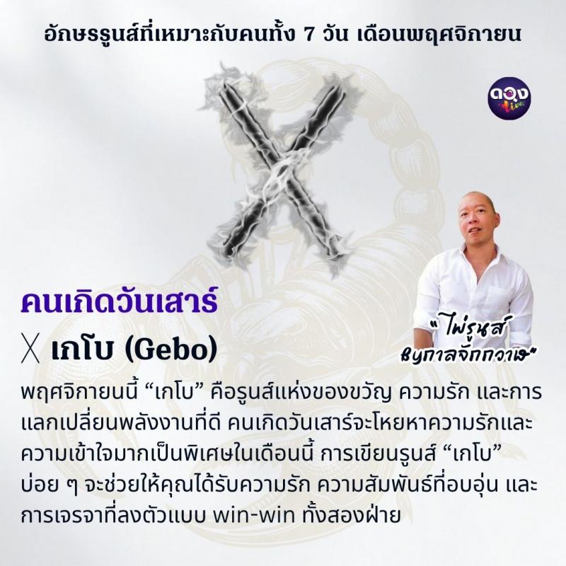 พฤศจิกายนนี้ “เกโบ” คือรูนส์แห่งของขวัญ ความรัก และการแลกเปลี่ยนพลังงานดีๆคนเกิดวันเสาร์จะโหยหาความรักและความเข้าใจมากเป็นพิเศษ เขียนรูนส์ “เกโบ” บ่อยๆจะช่วยให้คุณได้รับความรัก ความสัมพันธ์อบอุ่น และการเจรจาที่ลงตัวแบบ win-win ทั้งสองฝ่าย