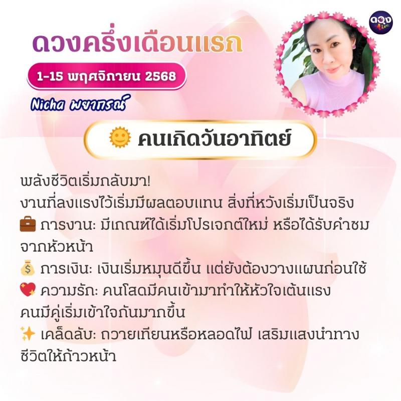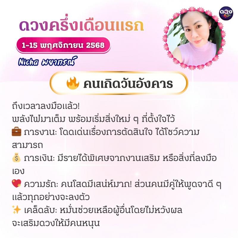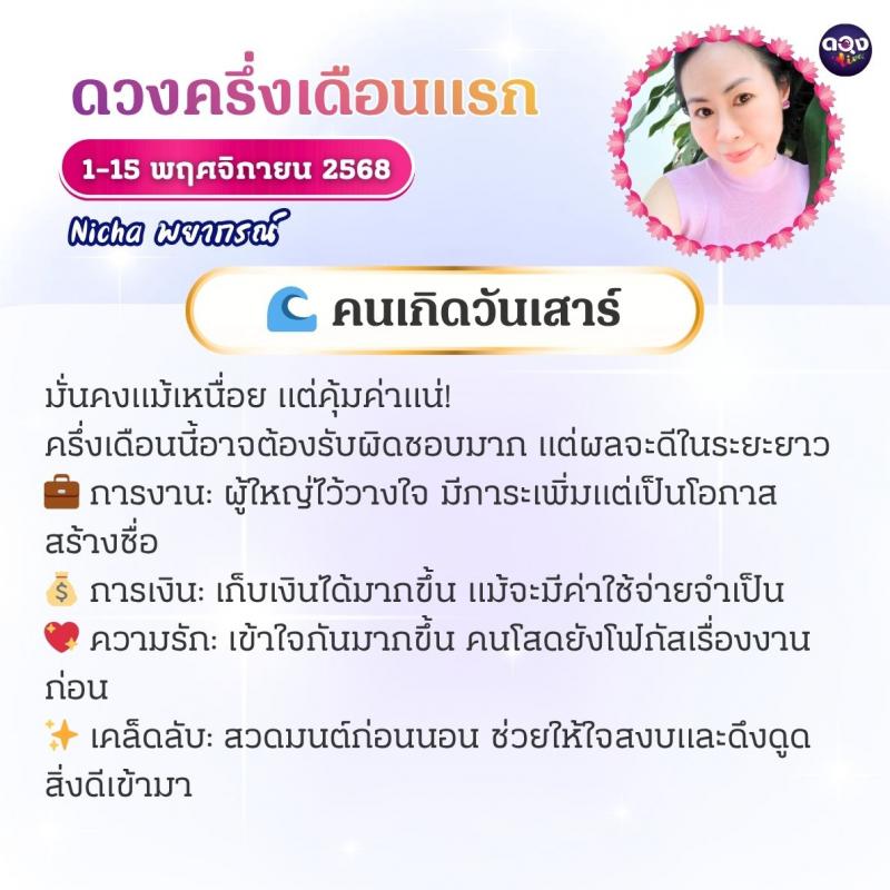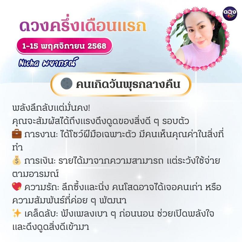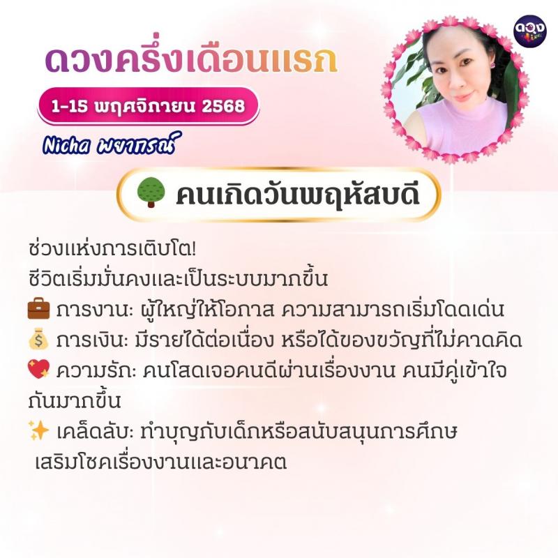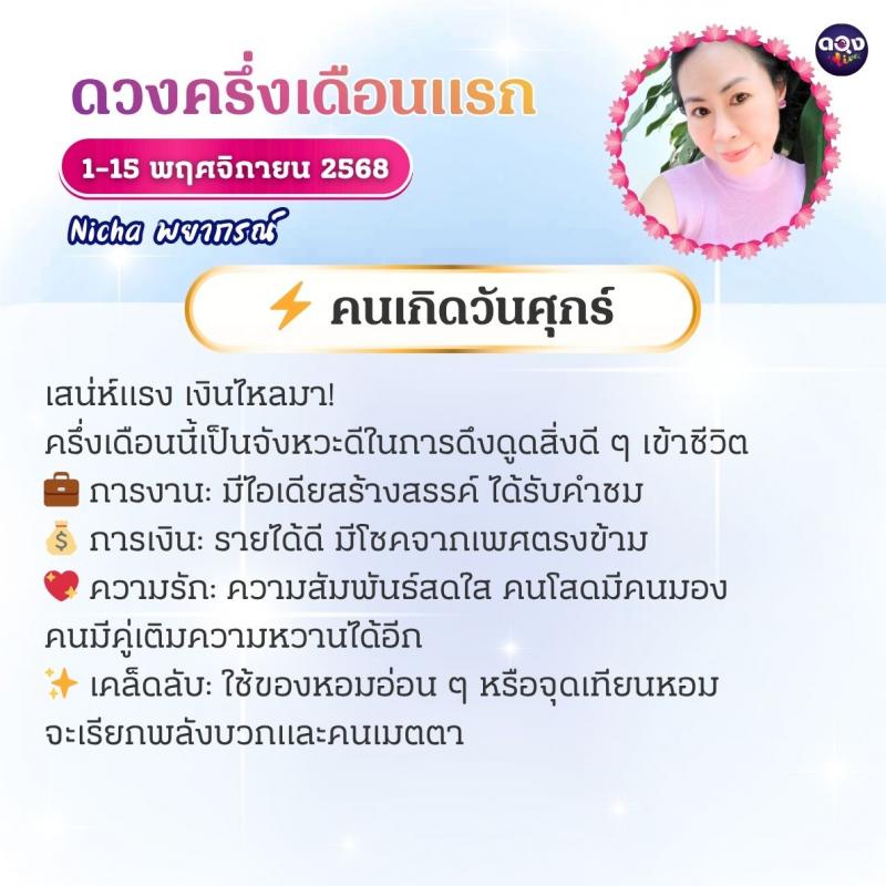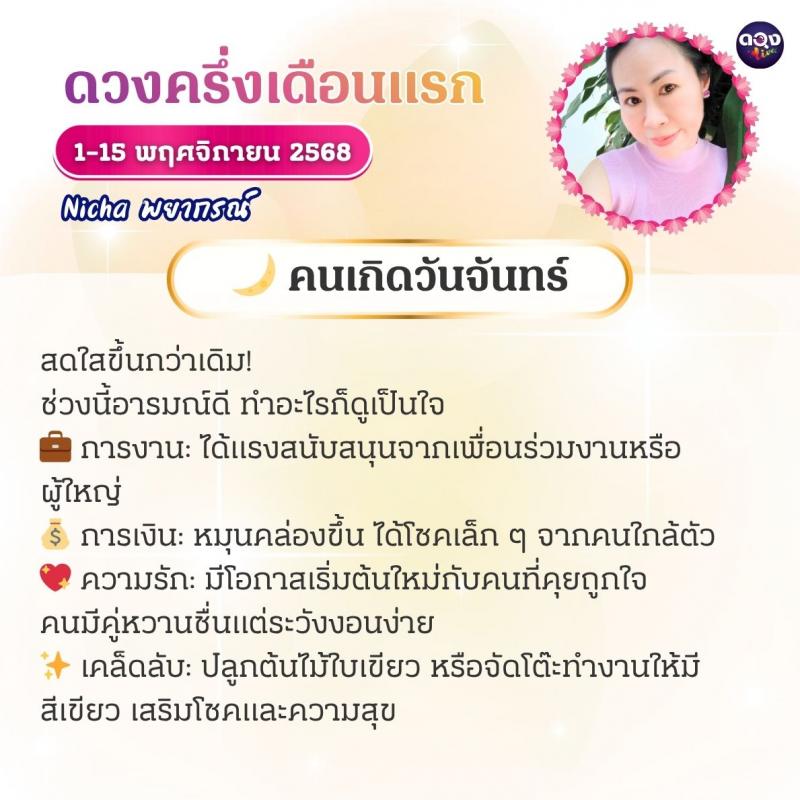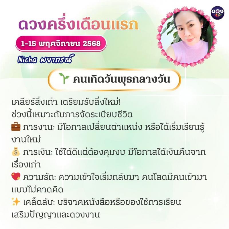 ดวงครึ่งเดือนแรก 1–15 พฤศจิกายน 2568 ทำนายโดย Nicha พยากรณ์