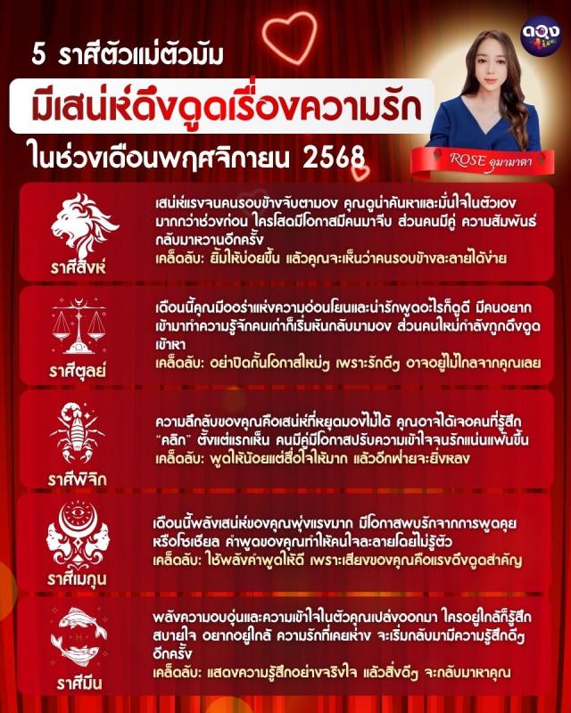 5 ราศีตัวแม่ตัวมัม มีเสน่ห์ดึงดูดเรื่องความรักในช่วงเดือนพฤศจิกายน 2568 BY ROSE อุมามาตา