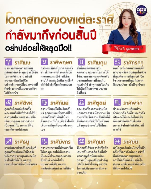 โอกาสทองของแต่ละราศีกำลังมาถึงก่อนสิ้นปี อย่าปล่อยให้หลุดมือ BY ROSE อุมามาตา