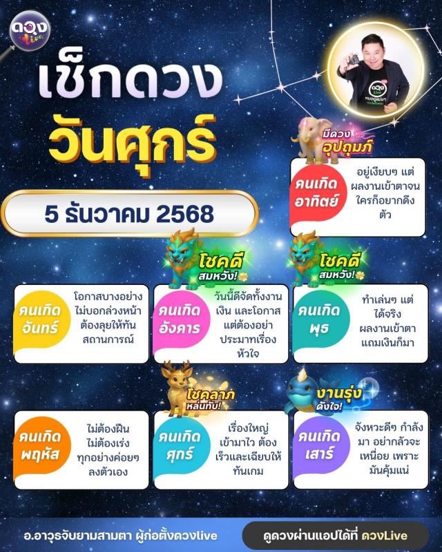 ดวงรายวันประจำวันศุกร์ที่ 5 ธันวาคม 2568 โดย อ.อาวุธจับยามสามตา – ผู้ก่อตั้งดวง Live