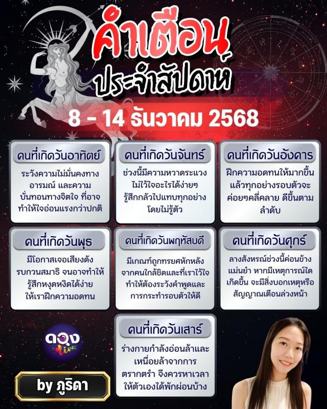 คำเตือนประจำสัปดาห์ 8 – 14 ธันวาคม 2568พยากรณ์โดย ภูริดา