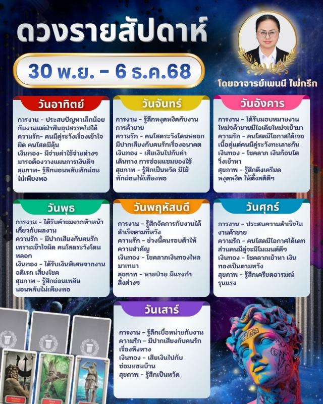 ดวงประจำสัปดาห์ 30 พฤศจิกายน – 6 ธันวาคม 2568โดยอาจารย์เพนนี ไพ่กรีก
