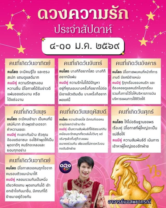 ดวงความรักประจำสัปดาห์ ตั้งแต่ วันที่ ๔-๑๐ มกราคม พ.ศ.๒๕๖๙ โดย อาจารย์มอสพยากรณ์