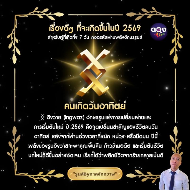ปี 2569 คือจุดเปลี่ยนสำคัญของชีวิตคนวันอาทิตย์ หลังจากผ่านช่วงเวลาที่หนัก หน่วง หรือมืดมน ปีนี้พลังของรูนอิงวาสจะพาคุณฟื้นคืน ก้าวข้ามอดีต และเริ่มต้นชีวิตบทใหม่ที่ดีขึ้นอย่างชัดเจน เรียกได้ว่าพลิกชีวิตจากร้ายกลายเป็นดี