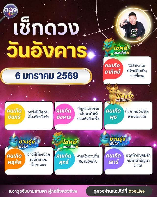 ดวงรายวันประจำวันอังคารที่ 6 มกราคม 2569 โดย อ.อาวุธจับยามสามตา – ผู้ก่อตั้งดวง Live