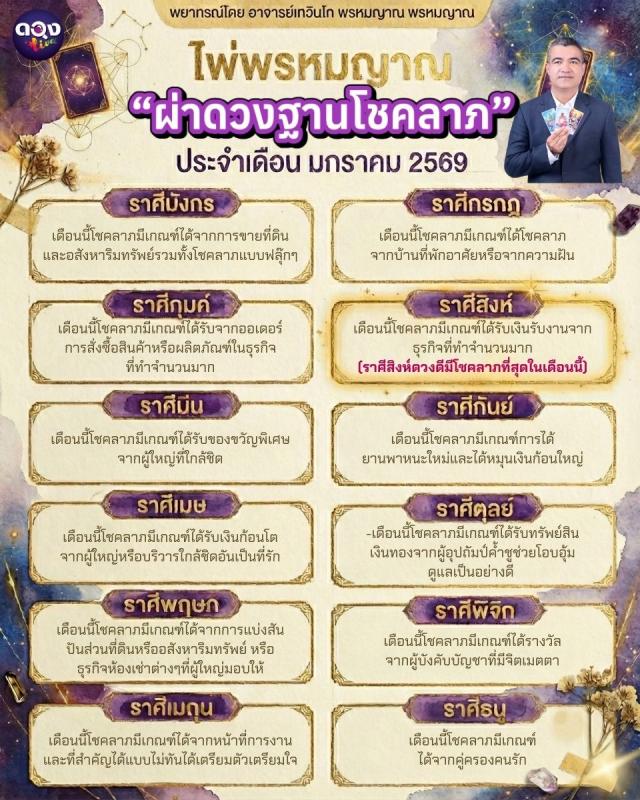 ไพ่พรหมญาณ “ผ่าดวงฐานโชคลาภ” ประจำเดือน มกราคม 2569 พยากรณ์โดย อาจารย์เทวินโท พรหมญาณ