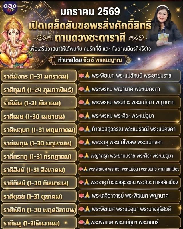 มกราคม 2569 เปิดเคล็ดลับขอพรสิ่งศักดิ์สิทธิ์ตามดวงชะตาราศี เพื่อเสริมวาสนาให้ได้พบกับ คนรักที่ดี และ กัลยาณมิตรที่จริงใจพยากรณ์ โดย จ๊ะเอ๋ พรหมญาณ