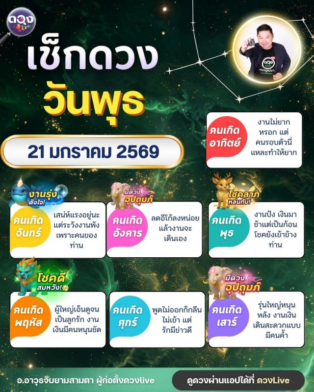 ดวงรายวันประจำวันพุธที่ 21 มกราคม 2569 โดย อ.อาวุธจับยามสามตา – ผู้ก่อตั้งดวง Live