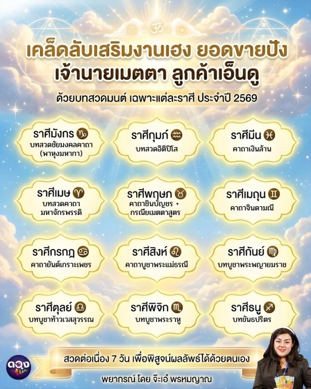 เคล็ดลับเสริมงานเฮง ยอดขายปัง เจ้านายเมตตา ลูกค้าเอ็นดู ด้วยบทสวดมนต์ เฉพาะแต่ละราศี ประจำปี 2569พยากรณ์ โดย จ๊ะเอ๋ พรหมญาณ
