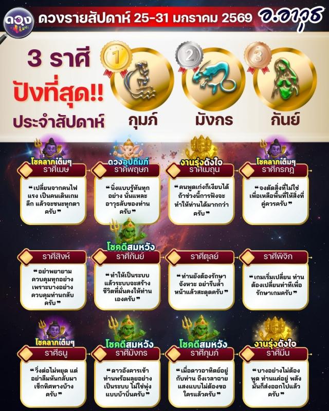 ดวงรายสัปดาห์ 25 – 31 มกราคม 2569 โดย อ.อาวุธ จับยามสามตา – ผู้ก่อตั้งดวง Live
