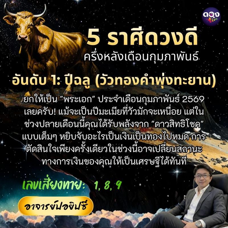 อันดับ 1: ปีฉลู (วัวทองคำพุ่งทะยาน) ยกให้เป็น "พระเอก" ประจำเดือนกุมภาพันธ์ 2569 เลยครับ! แม้จะเป็นปีมะเมียที่วัวมักจะเหนื่อย แต่ในช่วงปลายเดือนนี้คุณได้รับพลังจาก "ดาวสิทธิโชค" แบบเต็มๆ หยิบจับอะไรเป็นเงินเป็นทองไปหมด การตัดสินใจเพียงครั้งเดียวในช่วงนี้อาจเปลี่ยนสถานะทางการเงินของคุณให้เป็นเศรษฐีได้ทันที
