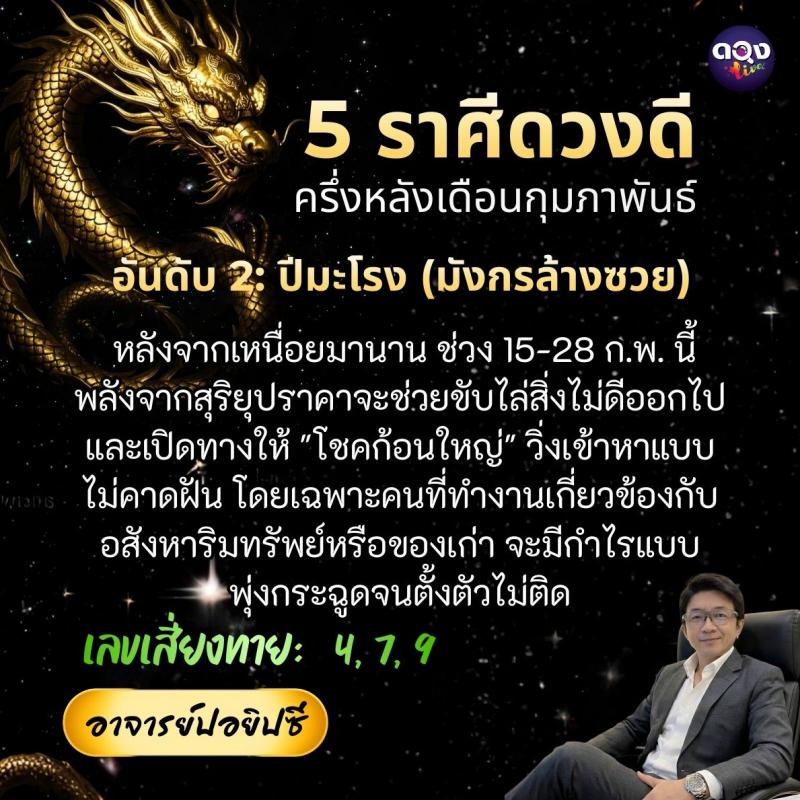 นี่คือ 5 อันดับปีนักษัตรที่ดวงพุ่งแรงที่สุด ในช่วงครึ่งหลังของเดือนกุมภาพันธ์ 2569 ครับ