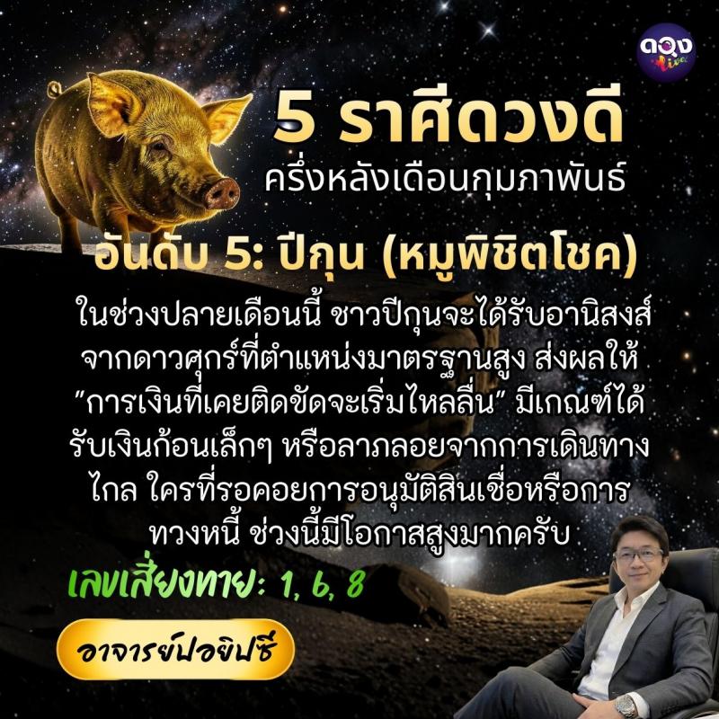 อันดับ 5: ปีกุน (หมูพิชิตโชค) ในช่วงปลายเดือนนี้ ชาวปีกุนจะได้รับอานิสงส์จากดาวศุกร์ที่ตำแหน่งมาตรฐานสูง ส่งผลให้ "การเงินที่เคยติดขัดจะเริ่มไหลลื่น" มีเกณฑ์ได้รับเงินก้อนเล็กๆ หรือลาภลอยจากการเดินทางไกล ใครที่รอคอยการอนุมัติสินเชื่อหรือการทวงหนี้ ช่วงนี้มีโอกาสสูงมากครับ