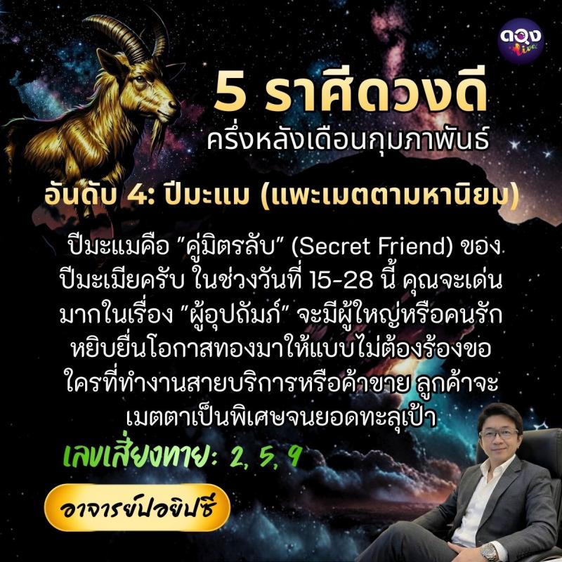 อันดับ 4: ปีมะแม (แพะเมตตามหานิยม) ปีมะแมคือ "คู่มิตรลับ" (Secret Friend) ของปีมะเมียครับ ในช่วงวันที่ 15-28 นี้ คุณจะเด่นมากในเรื่อง "ผู้อุปถัมภ์" จะมีผู้ใหญ่หรือคนรักหยิบยื่นโอกาสทองมาให้แบบไม่ต้องร้องขอ ใครที่ทำงานสายบริการหรือค้าขาย ลูกค้าจะเมตตาเป็นพิเศษจนยอดทะลุเป้า