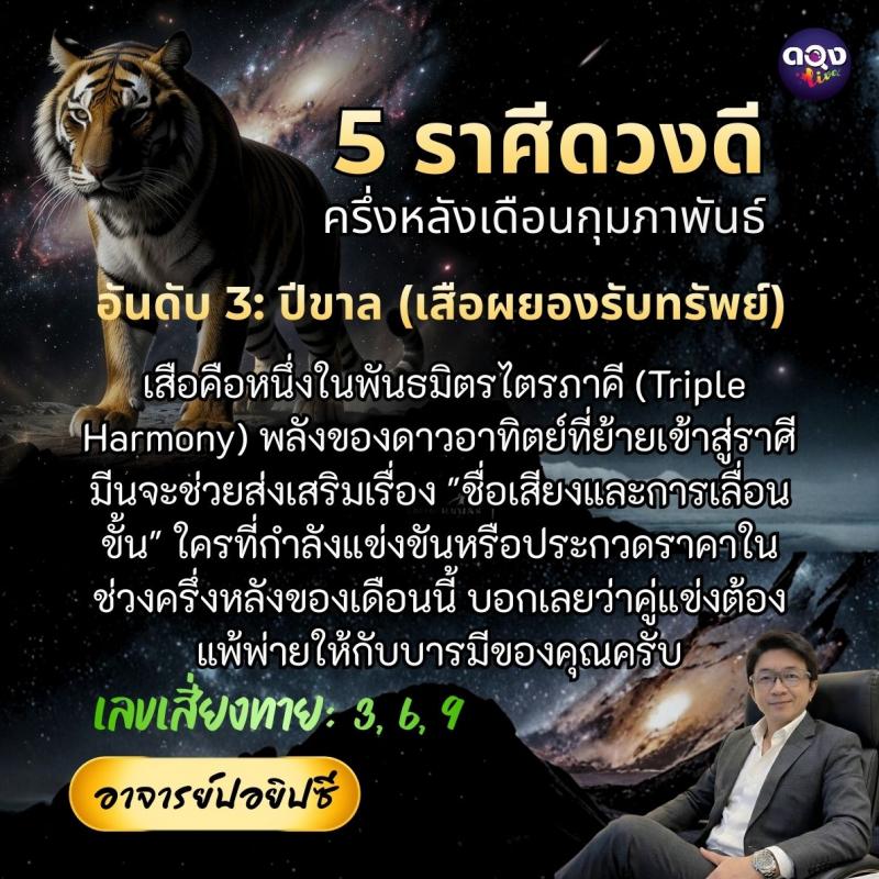 อันดับ 3: ปีขาล (เสือผยองรับทรัพย์) เสือคือหนึ่งในพันธมิตรไตรภาคี (Triple Harmony) พลังของดาวอาทิตย์ที่ย้ายเข้าสู่ราศีมีนจะช่วยส่งเสริมเรื่อง "ชื่อเสียงและการเลื่อนขั้น" ใครที่กำลังแข่งขันหรือประกวดราคาในช่วงครึ่งหลังของเดือนนี้ บอกเลยว่าคู่แข่งต้องแพ้พ่ายให้กับบารมีของคุณครับ
