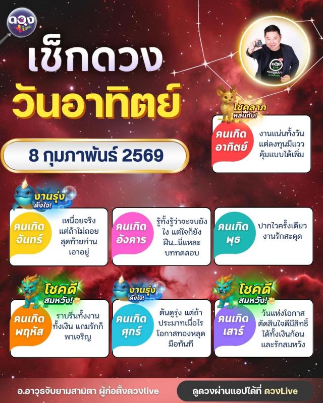 ดวงรายวันประจำวันอาทิตย์ที่ 8 กุมภาพันธ์ 2569 โดย อ.อาวุธจับยามสามตา – ผู้ก่อตั้งดวง Live