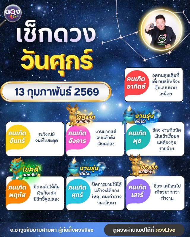 ดวงรายวันประจำวันศุกร์ที่ 13 กุมภาพันธ์ 2569 โดย อ.อาวุธจับยามสามตา – ผู้ก่อตั้งดวง Live