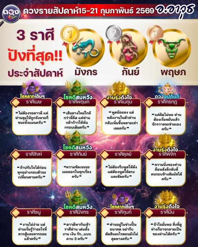 ดวงรายสัปดาห์ 15 – 21 กุมภาพันธ์ 2569 โดย อ.อาวุธ จับยามสามตา – ผู้ก่อตั้งดวง Live