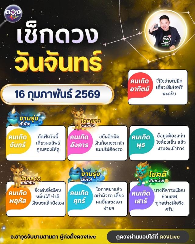 ดวงรายวันประจำวันจันทร์ที่ 16 กุมภาพันธ์ 2569 โดย อ.อาวุธจับยามสามตา – ผู้ก่อตั้งดวง Live