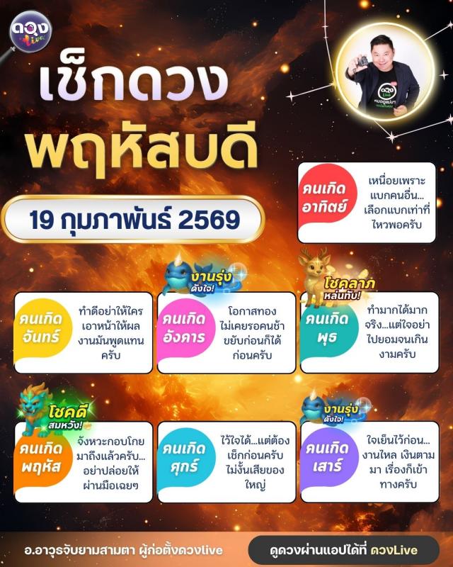 ดวงรายวันประจำวันพฤหัสบดีที่ 19 กุมภาพันธ์ 2569 โดย อ.อาวุธจับยามสามตา – ผู้ก่อตั้งดวง Live