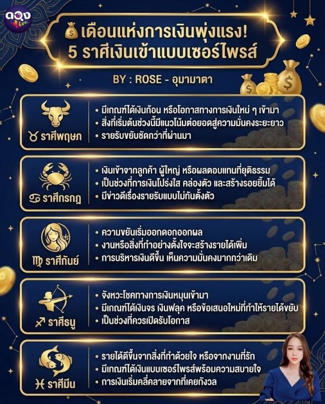 เดือนแห่งการเงินพุ่งแรง! 5 ราศีเงินเข้าแบบเซอร์ไพรส์ BY : ROSE - อุมามาตา