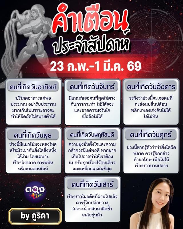 คำเตือนประจำสัปดาห์ 23 ก.พ.-1 มี.ค. 69 ทำนายโดย ภูริดา