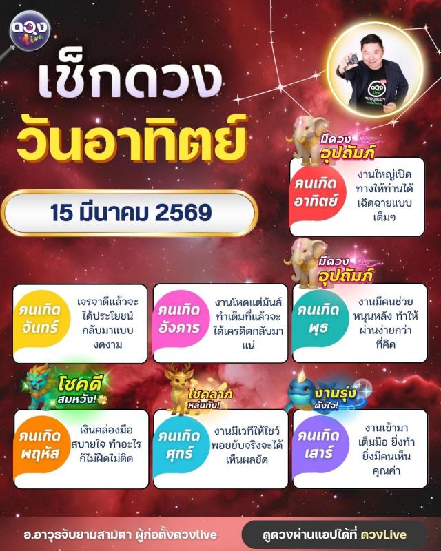 ดวงรายวันประจำวันอาทิตย์ที่ 15 มีนาคม 2569 โดย อ.อาวุธจับยามสามตา – ผู้ก่อตั้งดวง Live