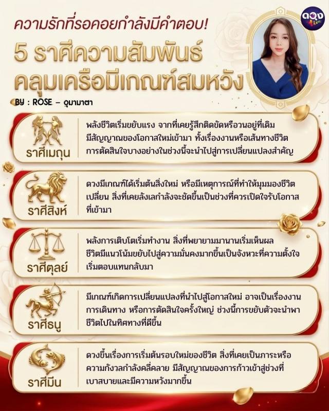 ความรักที่รอคอยกำลังมีคำตอบ! 5 ราศีความสัมพันธ์คลุมเครือมีเกณฑ์สมหวัง BY : ROSE – อุมามาตา