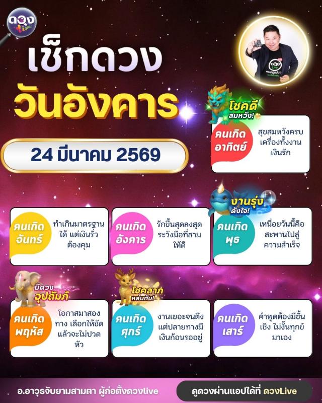 ดวงรายวันประจำวันอังคารที่ 24 มีนาคม 2569 โดย อ.อาวุธจับยามสามตา – ผู้ก่อตั้งดวง Live