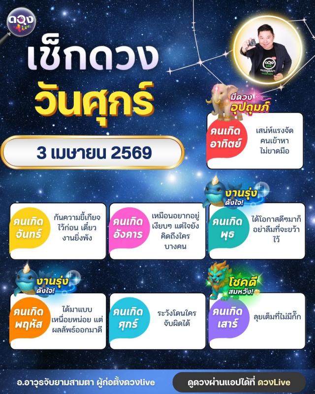 ดวงรายวันประจำวันศุกร์ที่ 3 เมษายน 2569 โดย อ.อาวุธจับยามสามตา – ผู้ก่อตั้งดวง Live