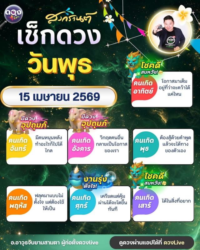 ดวงรายวัน พุธที่ 15 เมษายน 2569 ทำนายโดย อ.อาวุธจับยามสามตา – ผู้ก่อตั้งดวง Live