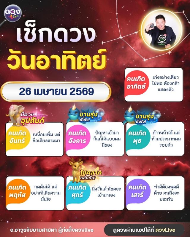 ดวงรายวัน อาทิตย์ที่ 26 เมษายน 2569ทำนายโดย อ.อาวุธจับยามสามตา – ผู้ก่อตั้งดวง Live