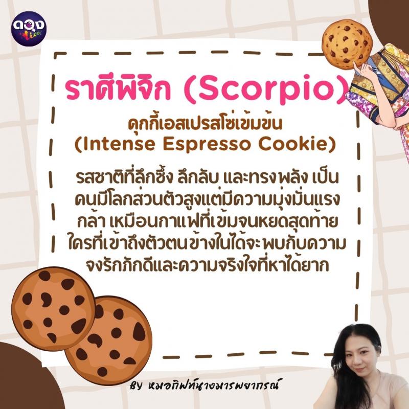 ♏️ ราศีพิจิก (Scorpio): คุกกี้เอสเปรสโซเข้มข้น (Intense Espresso Cookie) รสชาติที่ลึกซึ้ง ลึกลับ และทรงพลัง เป็นคนมีโลกส่วนตัวสูงแต่มีความมุ่งมั่นแรงกล้า เหมือนกาแฟที่เข้มจนหยดสุดท้าย ใครที่เข้าถึงตัวตนข้างในได้จะพบกับความจงรักภักดีและความจริงใจที่หาได้ยาก