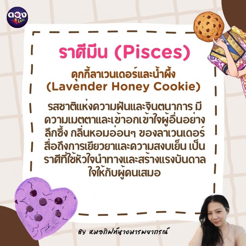 ♓️ ราศีมีน (Pisces): คุกกี้ลาเวนเดอร์และน้ำผึ้ง (Lavender Honey Cookie) รสชาติแห่งความฝันและจินตนาการ มีความเมตตาและเข้าอกเข้าใจผู้อื่นอย่างลึกซึ้ง กลิ่นหอมอ่อนๆ ของลาเวนเดอร์สื่อถึงการเยียวยาและความสงบเย็น เป็นราศีที่ใช้หัวใจนำทางและสร้างแรงบันดาลใจให้กับผู้คนเสมอ