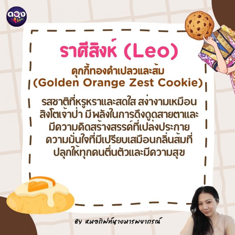 ♌️ ราศีสิงห์ (Leo): คุกกี้ทองคำเปลวและส้ม (Golden Orange Zest Cookie) รสชาติที่หรูหราและสดใส สง่างามเหมือนสิงโตเจ้าป่า มีพลังในการดึงดูดสายตาและมีความคิดสร้างสรรค์ที่เปล่งประกาย ความมั่นใจที่มีเปรียบเสมือนกลิ่นส้มที่ปลุกให้ทุกคนตื่นตัวและมีความสุข