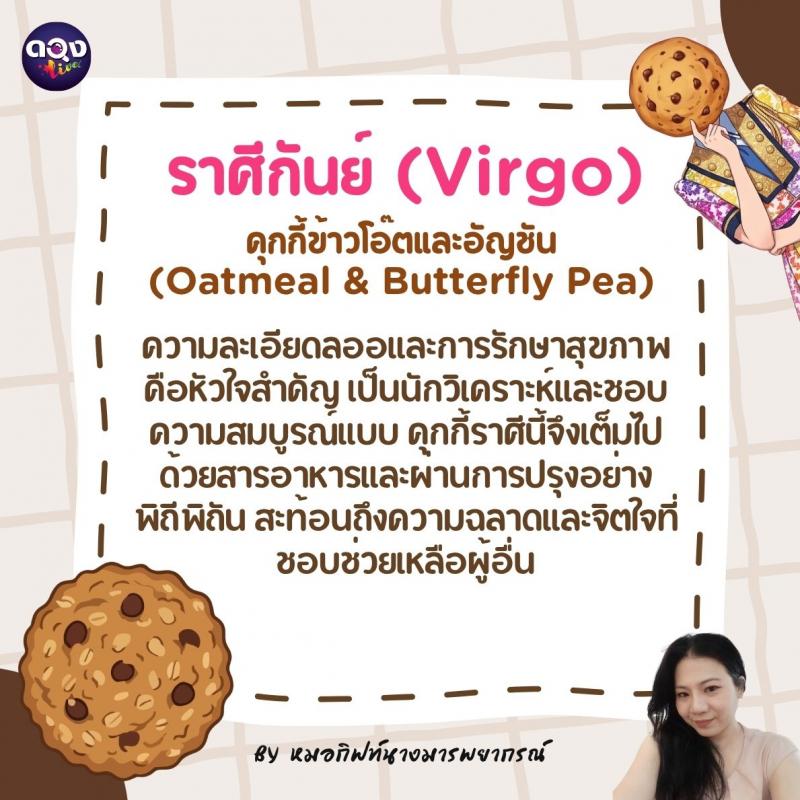 ♍️ ราศีกันย์ (Virgo): คุกกี้ข้าวโอ๊ตและอัญชัน (Oatmeal & Butterfly Pea) ความละเอียดลออและการรักษาสุขภาพคือหัวใจสำคัญ เป็นนักวิเคราะห์และชอบความสมบูรณ์แบบ คุกกี้ราศีนี้จึงเต็มไปด้วยสารอาหารและผ่านการปรุงอย่างพิถีพิถัน สะท้อนถึงความฉลาดและจิตใจที่ชอบช่วยเหลือผู้อื่น