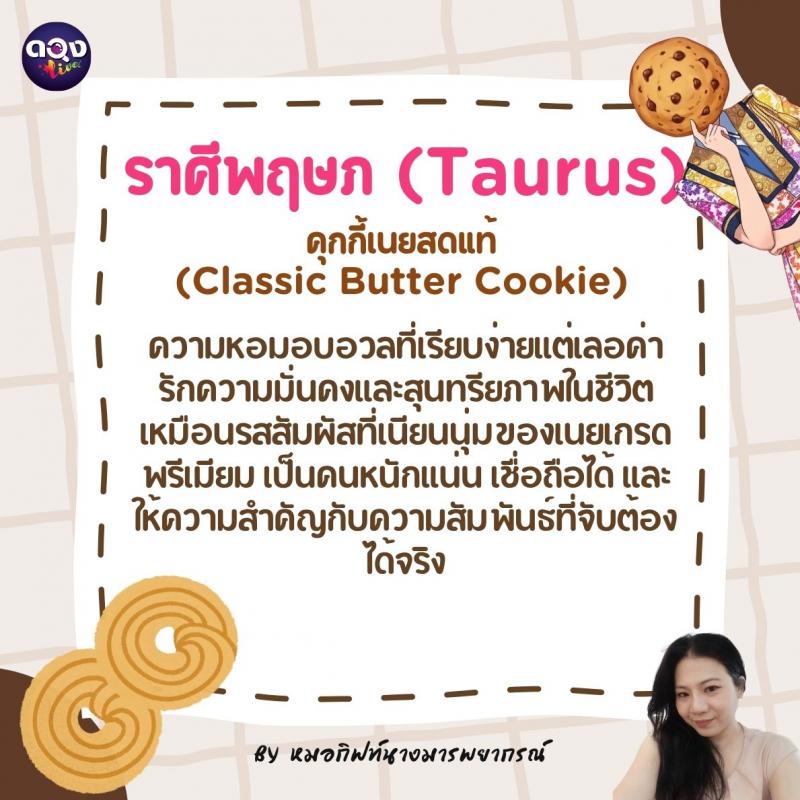 ♉️ ราศีพฤษภ (Taurus): คุกกี้เนยสดแท้ (Classic Butter Cookie) ความหอมอบอวลที่เรียบง่ายแต่เลอค่า รักความมั่นคงและสุนทรียภาพในชีวิตเหมือนรสสัมผัสที่เนียนนุ่มของเนยเกรดพรีเมียม เป็นคนหนักแน่น เชื่อถือได้ และให้ความสำคัญกับความสัมพันธ์ที่จับต้องได้จริง
