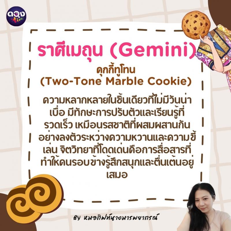 ♊️ ราศีมิถุน (Gemini): คุกกี้ทูโทน (Two-Tone Marble Cookie) ความหลากหลายในชิ้นเดียวที่ไม่มีวันน่าเบื่อ มีทักษะการปรับตัวและเรียนรู้ที่รวดเร็ว เหมือนรสชาติที่ผสมผสานกันอย่างลงตัวระหว่างความหวานและความขี้เล่น จิตวิทยาที่โดดเด่นคือการสื่อสารที่ทำให้คนรอบข้างรู้สึกสนุกและตื่นเต้นอยู่เสมอ
