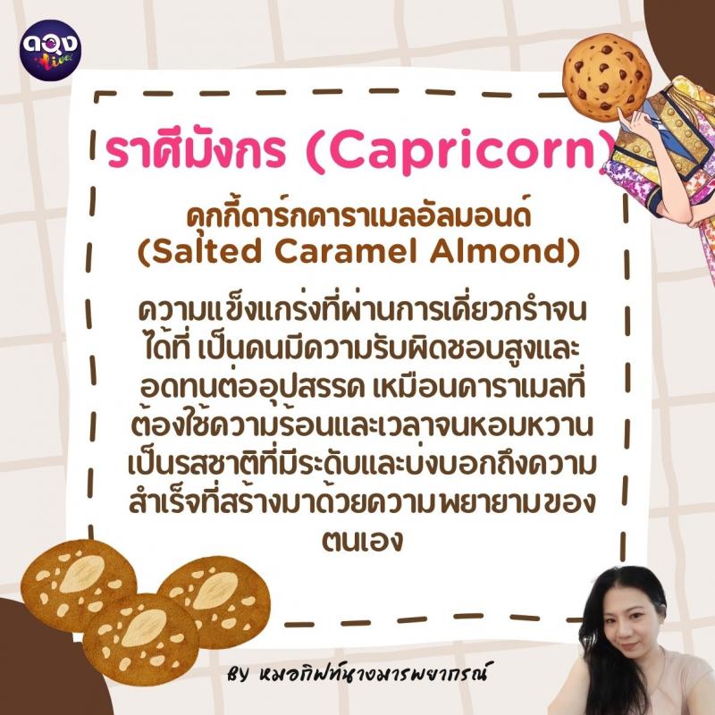♑️ ราศีมังกร (Capricorn): คุกกี้ดาร์กคาราเมลอัลมอนด์ (Salted Caramel Almond) ความแข็งแกร่งที่ผ่านการเคี่ยวกรำจนได้ที่ เป็นคนมีความรับผิดชอบสูงและอดทนต่ออุปสรรค เหมือนคาราเมลที่ต้องใช้ความร้อนและเวลาจนหอมหวาน เป็นรสชาติที่มีระดับและบ่งบอกถึงความสำเร็จที่สร้างมาด้วยความพยายามของตนเอง